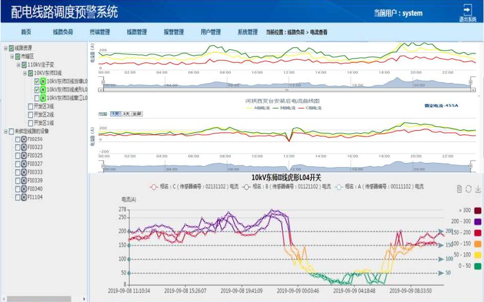 導(dǎo)線負(fù)荷溫升監(jiān)測(cè)系統(tǒng)綜合運(yùn)用了太陽能取電、無線通信及信息網(wǎng)絡(luò)等現(xiàn)代科學(xué)新技術(shù)。能實(shí)時(shí)準(zhǔn)確地在線監(jiān)測(cè)線路狀態(tài),并將所采集到的負(fù)荷及溫度等信息發(fā)送回主站中心;主站對(duì)信息進(jìn)行數(shù)據(jù)統(tǒng)計(jì)、分析、拓?fù)溆?jì)算,確定負(fù)荷溫升狀態(tài),從而引導(dǎo)工作人員定位隱患。為提高相關(guān)工作人員的效率、減輕勞動(dòng)強(qiáng)度提供了一種強(qiáng)有力的手段;同時(shí),溫度信息會(huì)通過短消息發(fā)送到供電局生產(chǎn)管理部門、線路專工、線路維護(hù)負(fù)責(zé)人等設(shè)定的相關(guān)人員的手機(jī)上,能有效提高線路故障檢測(cè)的自動(dòng)化水平,及時(shí)為線路安全性能監(jiān)測(cè)提供科學(xué)有效的依據(jù),為電力的輸送及減人增效提供條件。