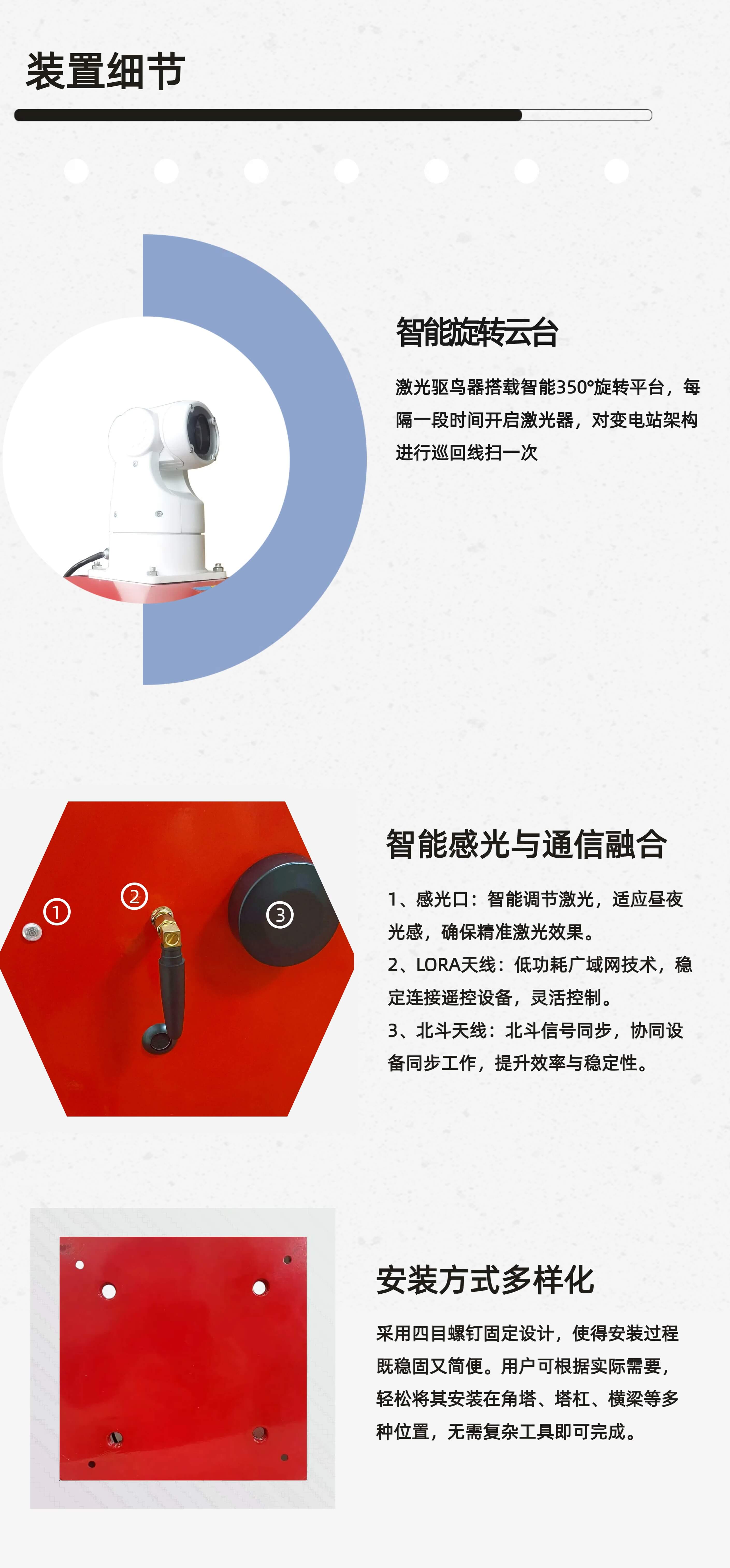 激光驅鳥器主要由一字線激光器和智能云臺兩個重要部件組成。一字線激光器射出一字線的激光,同市面上大多數(shù)點狀式激光有所不同,一字線對驅趕變電站架構上的鳥類更為方便;激光器裝載在智能云臺上,通過云臺的轉動進行掃描。整機具備欠壓過壓保護、遙控器遠程遙控、定時功能、分時控保護激光器的功能,安裝使用簡單方便。