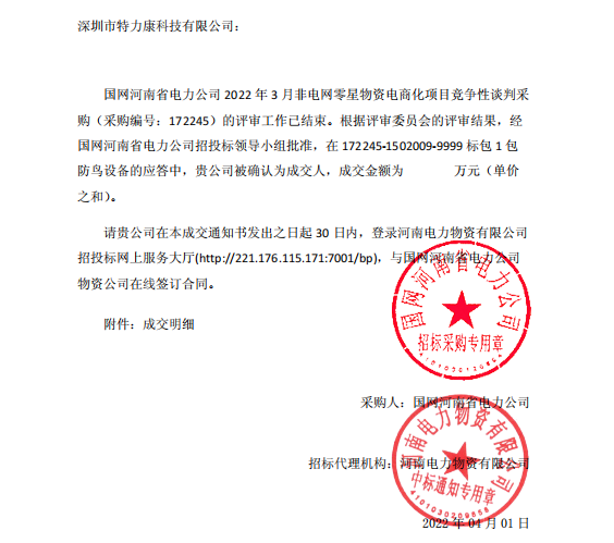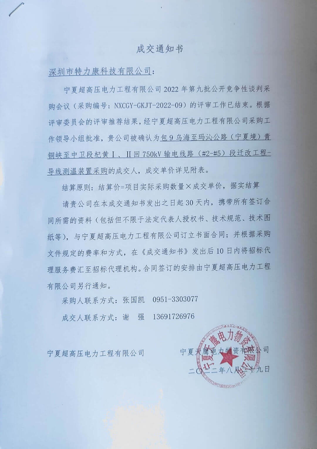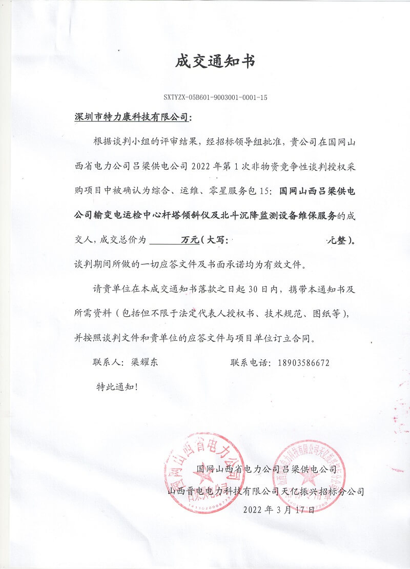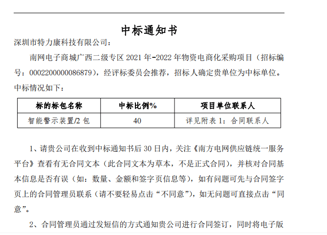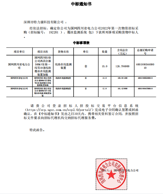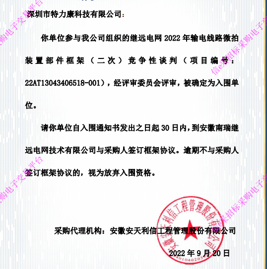 特力康中標國網(wǎng)黑龍江送變電工程公司的2024年度第18次物資類競爭性談判采購項目——慶陽驅(qū)鳥器物資框 特力康中標國網(wǎng)甘肅省電力公司省管產(chǎn)業(yè)單位2024年第五次物資競爭性談判授權(quán)采購項目 中標喜訊:深圳市特力康科技有限公司成功入圍許繼集團綜合能源公司輸電線路視頻在線監(jiān)測裝置模塊集采項目 中標喜訊:特力康成功中標國網(wǎng)重慶市電力公司渝中一片區(qū)項目 特力康成功中標國網(wǎng)天津市電力公司2024年第二次?物?資招標項目 特力康中標國網(wǎng)安徽省電力有限公司蕪湖供電公司2024年3月非物質(zhì)采購項目 破解采空區(qū)隱患:山西電力裝特力康通用型監(jiān)測裝置,守鐵塔穩(wěn)運行 四川電力用特力康架空輸電線路山火監(jiān)測裝置,筑牢林區(qū)輸電 “防火墻”? 遼寧電力啟用特力康多視角監(jiān)拍裝置,全維度守護輸電安全? 破解黃土高原沉降難題:山西電力用特力康北斗裝置守桿塔安全? 山東電力啟用特力康動態(tài)版智能激光驅(qū)鳥器,動態(tài)防控守護變電站安全? 湖南超高壓電力啟用特力康球機 AI 監(jiān)測裝置,智能守護輸電通道安全? 廣西電力啟用特力康高壓電纜護層環(huán)流監(jiān)控設(shè)備,筑牢電纜安全防線? 寧夏配電線路安裝了我司防外破電子化智能警示牌