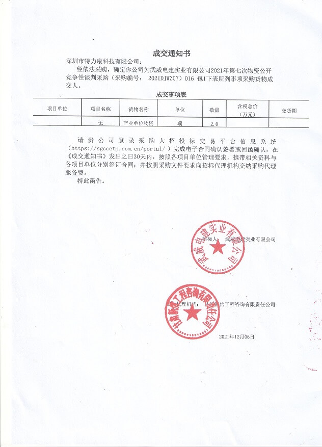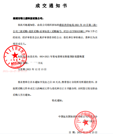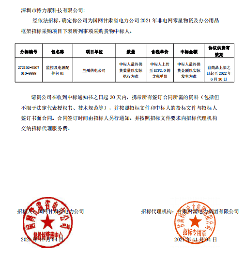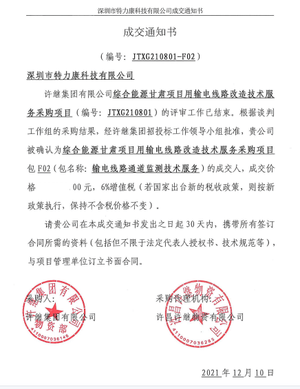 特力康中標(biāo)國(guó)網(wǎng)黑龍江送變電工程公司的2024年度第18次物資類競(jìng)爭(zhēng)性談判采購(gòu)項(xiàng)目——慶陽(yáng)驅(qū)鳥器物資框 特力康中標(biāo)國(guó)網(wǎng)甘肅省電力公司省管產(chǎn)業(yè)單位2024年第五次物資競(jìng)爭(zhēng)性談判授權(quán)采購(gòu)項(xiàng)目 中標(biāo)喜訊:深圳市特力康科技有限公司成功入圍許繼集團(tuán)綜合能源公司輸電線路視頻在線監(jiān)測(cè)裝置模塊集采項(xiàng)目 中標(biāo)喜訊:特力康成功中標(biāo)國(guó)網(wǎng)重慶市電力公司渝中一片區(qū)項(xiàng)目 特力康成功中標(biāo)國(guó)網(wǎng)天津市電力公司2024年第二次?物?資招標(biāo)項(xiàng)目 特力康中標(biāo)國(guó)網(wǎng)安徽省電力有限公司蕪湖供電公司2024年3月非物質(zhì)采購(gòu)項(xiàng)目 破解采空區(qū)隱患:山西電力裝特力康通用型監(jiān)測(cè)裝置,守鐵塔穩(wěn)運(yùn)行 四川電力用特力康架空輸電線路山火監(jiān)測(cè)裝置,筑牢林區(qū)輸電 “防火墻”? 遼寧電力啟用特力康多視角監(jiān)拍裝置,全維度守護(hù)輸電安全? 破解黃土高原沉降難題:山西電力用特力康北斗裝置守桿塔安全? 山東電力啟用特力康動(dòng)態(tài)版智能激光驅(qū)鳥器,動(dòng)態(tài)防控守護(hù)變電站安全? 湖南超高壓電力啟用特力康球機(jī) AI 監(jiān)測(cè)裝置,智能守護(hù)輸電通道安全? 廣西電力啟用特力康高壓電纜護(hù)層環(huán)流監(jiān)控設(shè)備,筑牢電纜安全防線? 寧夏配電線路安裝了我司防外破電子化智能警示牌