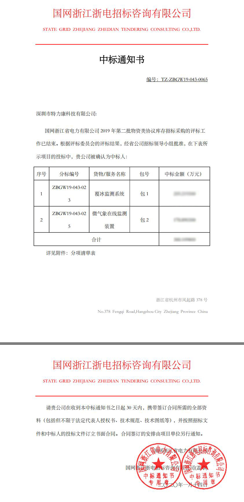 國網(wǎng)浙江省電力有限公司2019年第二批物資類協(xié)議庫存招標(biāo)采購的評(píng)標(biāo)工作已結(jié)束。根據(jù)評(píng)標(biāo)委員會(huì)的評(píng)標(biāo)結(jié)果,經(jīng)省公司招標(biāo)領(lǐng)導(dǎo)小組批準(zhǔn),我司(深圳市特力康科技有限公司)中標(biāo)ZBGW19-043-023覆冰監(jiān)測系統(tǒng)包1及ZBGW19-043-025微氣象在線監(jiān)測包2兩個(gè)標(biāo)包,現(xiàn)附中標(biāo)通知書如下: