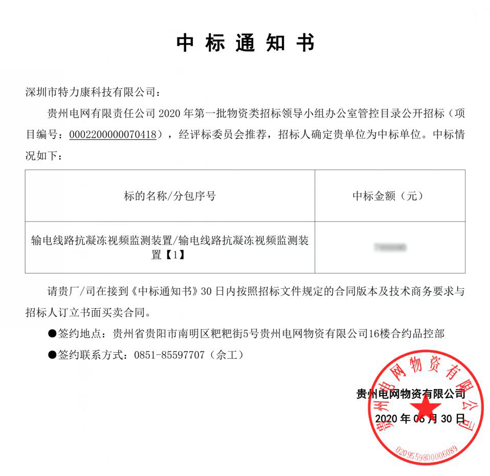我司(深圳市特力康科技有限公司)在投標(biāo)貴州電網(wǎng)有限責(zé)任公司2020年第一批物資類招標(biāo)領(lǐng)導(dǎo)小組辦公室管控目錄公開招標(biāo)(項(xiàng)目編號: 0000000070418) 中輸電線路抗凝凍視頻監(jiān)測裝置標(biāo)包,經(jīng)評標(biāo)委員會(huì)推薦,招標(biāo)人確定我司為中標(biāo)單位。特發(fā)中標(biāo)通知書,如下: