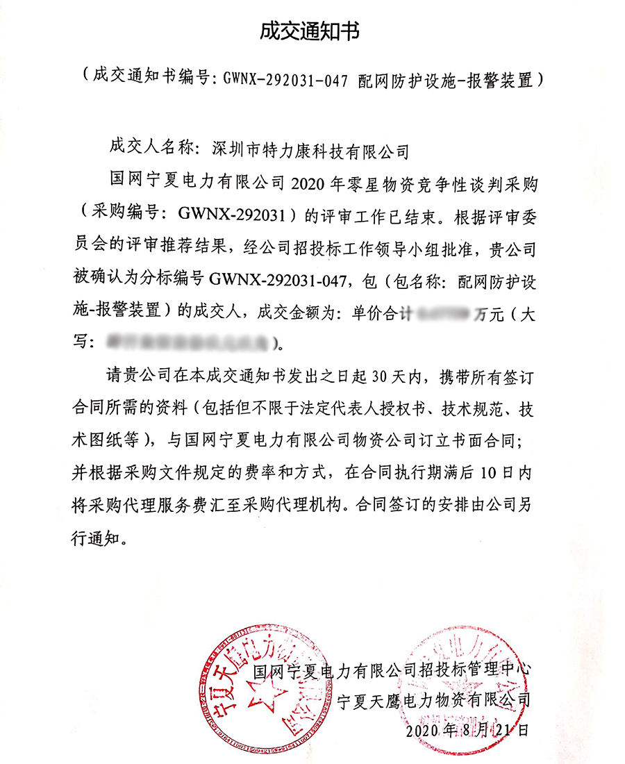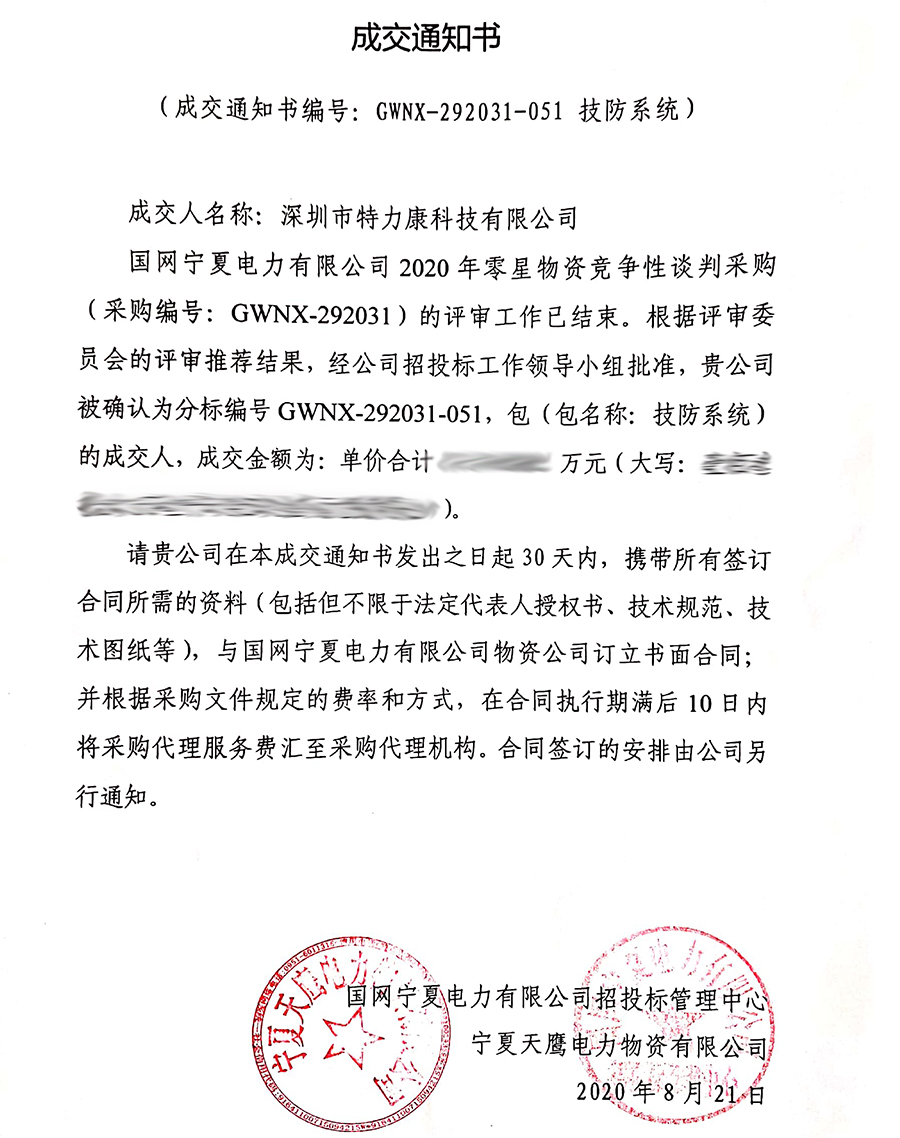 國(guó)網(wǎng)寧夏電力有限公司2020年零星物資競(jìng)爭(zhēng)性談判采購(gòu)(采購(gòu)編號(hào): GWNX-292031)的評(píng)審工作已結(jié)束。根據(jù)評(píng)審委員會(huì)的評(píng)審?fù)扑]結(jié)果,經(jīng)招投標(biāo)工作領(lǐng)導(dǎo)小組批準(zhǔn),我司(深圳市特力康科技有限公司)被確認(rèn)為分標(biāo)編號(hào)GWNX-292031-047,包(包名稱(chēng):配網(wǎng)防護(hù)設(shè)施-報(bào)警裝置)及分標(biāo)編號(hào)GWNX-292031-051,包(包名稱(chēng):技防系統(tǒng))的成交人,現(xiàn)發(fā)布成交通知書(shū)如下: