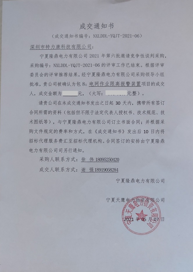 寧夏隆鼎電力有限公司2021年第六批邀請競爭性談判采購,采購編號: NXLDDL-YQJT -2021-06的評審工作已結(jié)束。根據(jù)評審委員會的評審?fù)扑]結(jié)果,經(jīng)寧夏隆鼎電力有限公司采購領(lǐng)導(dǎo)小組批準,我司被確認為包8:電網(wǎng)作業(yè)限高報警裝置項目的成交人,中標通知如下:
