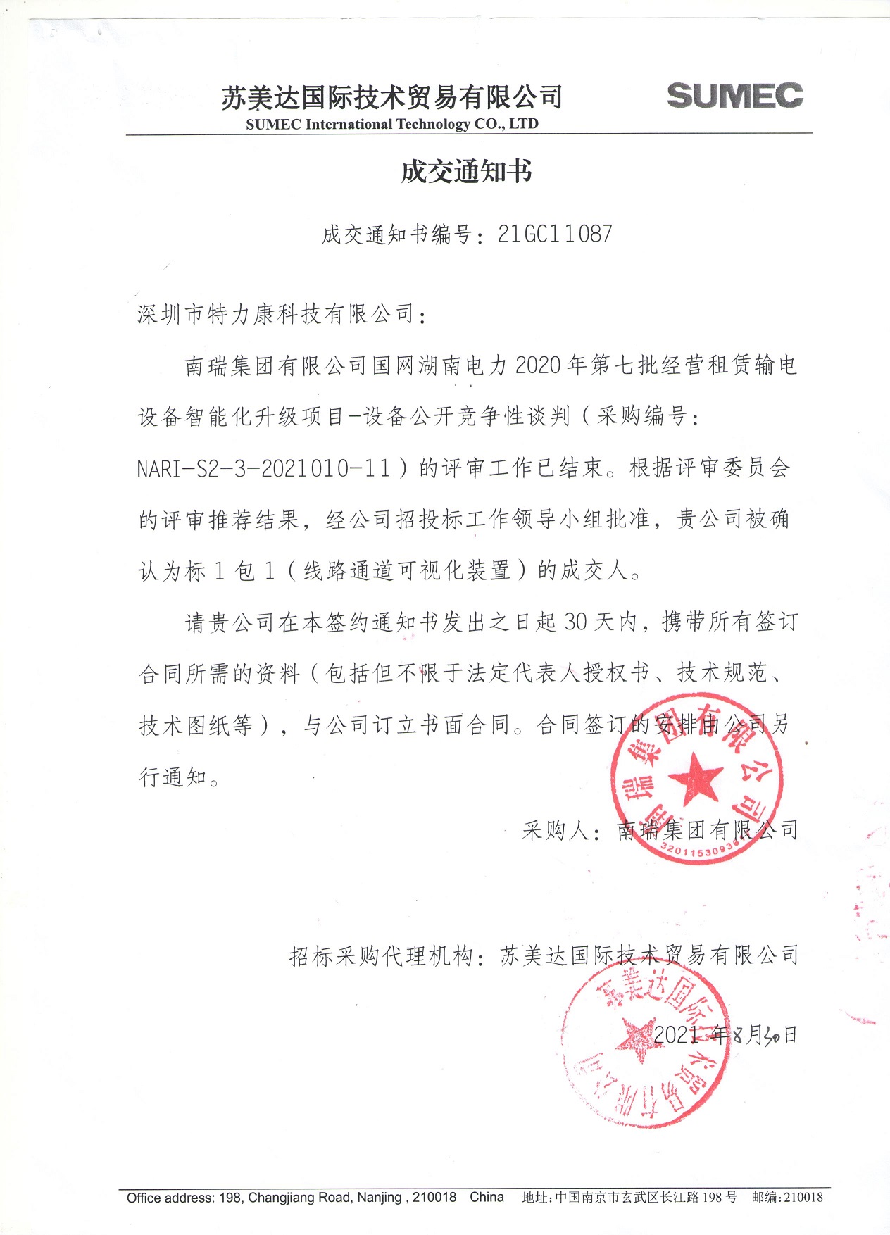 南瑞集團(tuán)有限公司國網(wǎng)湖南電力2020年第七批經(jīng)營租賃輸電設(shè)備智能化升級(jí)項(xiàng)目-設(shè)備公開競(jìng)爭(zhēng)性談判(采購編號(hào):NARI-S2-3-2021010-11 )的評(píng)審工作已結(jié)束。根據(jù)評(píng)審委員會(huì)的評(píng)審?fù)扑]結(jié)果,經(jīng)公司招投標(biāo)工作領(lǐng)導(dǎo)小組批準(zhǔn),我司被確認(rèn)為標(biāo)1包1 (線路通道可視化裝置)的成交人。中標(biāo)公告如下: