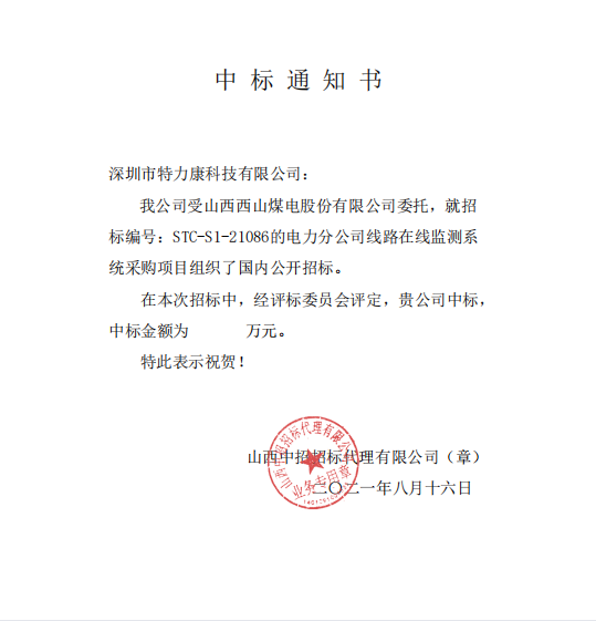 我公可受山西西山煤電股份有限公司委托,就招標(biāo)編號:STC-S1-21086的電力分公司線路在線監(jiān)測系統(tǒng)采購項目組織了國內(nèi)公開招標(biāo)。在本次招標(biāo)中,經(jīng)評標(biāo)委員會評定,我司公司中標(biāo),中標(biāo)公告如下: