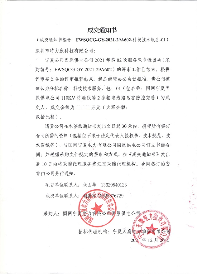 寧夏公司固原供電公司2021年第02次服務(wù)競(jìng)爭(zhēng)性談判(采購編號(hào): FWSQCG-GY-2021-29A602) 的評(píng)審工作已結(jié)束。根據(jù)評(píng)審委員會(huì)的評(píng)審?fù)扑]結(jié)果,經(jīng)總經(jīng)理辦公會(huì)議批準(zhǔn),貴公司被確認(rèn)為分標(biāo)名稱:科技技術(shù)服務(wù),包: 01 (包名稱:國網(wǎng)寧夏固原供電公司110KV將渝線等2條輸電線路鳥害防控完善)的成交人,成交通知如下: