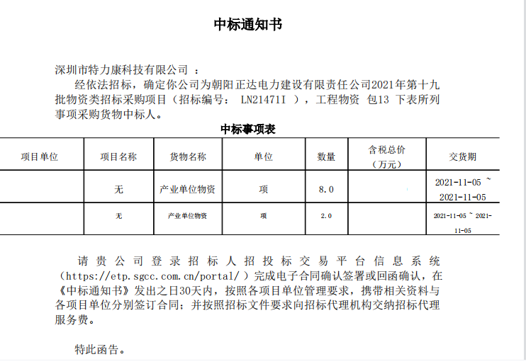 經(jīng)依法招標,確定我司為朝陽正達電力建設有限責任公司2021年第十九批物資類招標采購項目(招標編號: LN21471I )工程物資包,中標通知如下: