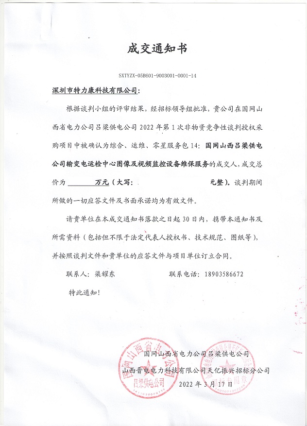 根據(jù)談判小組的評審結(jié)果,經(jīng)招標(biāo)領(lǐng)導(dǎo)組批準(zhǔn),貴公司在國網(wǎng)山西省電力公司呂梁供電公司2022年第1次非物資競爭性談判授權(quán)采購項目中被確認(rèn)為綜合、運維,零星服務(wù)包14:國網(wǎng)山西呂梁供電公司榆變電運檢中心圖像及視頻監(jiān)控設(shè)備維保服務(wù)的成交人,中標(biāo)公告如下: